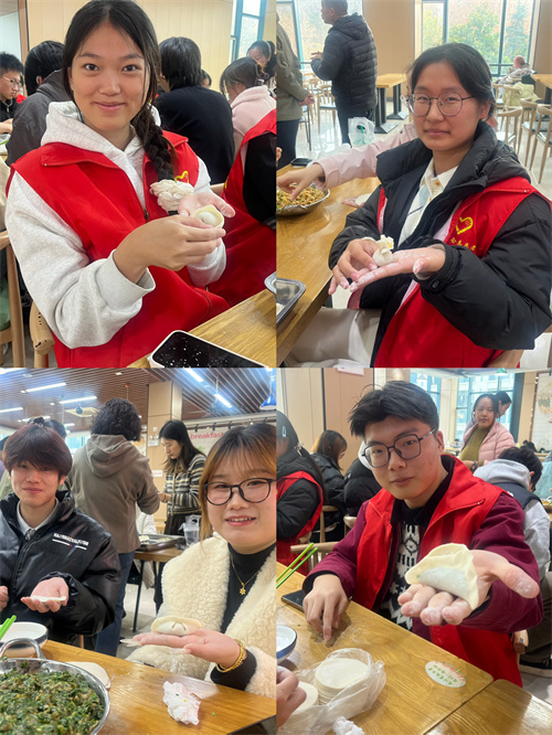 活动现场热闹非凡,同学们分组围在桌旁包饺子,说起家乡的习俗,其乐融融。在包饺子环节中,同学们热情交流,积极互动,纷纷撸起袖子,化身“饺子大师”。餐厅工作人员亲自示范,耐心教授包饺子技巧,同学们积极响应,迅速实践,从专注捏褶成型,到摆盘收拾,大家团结协作,共同包制出形态各异、精巧别致的饺子。