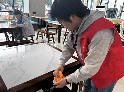 在食堂工作人员的耐心指导下,大家分工协作、有序开展各项服务工作。他们认真向食堂阿姨学习餐具分类与回收的流程,引导同学们用餐结束后将餐具放在指定地点,仔细擦拭每一张餐桌,提醒同学们践行“光盘行动”,节约用餐,开展食堂满意度调查。通过亲身参与,志愿者们更加体会到食堂工作人员的不易,也对劳动的意义有了更真切的理解。